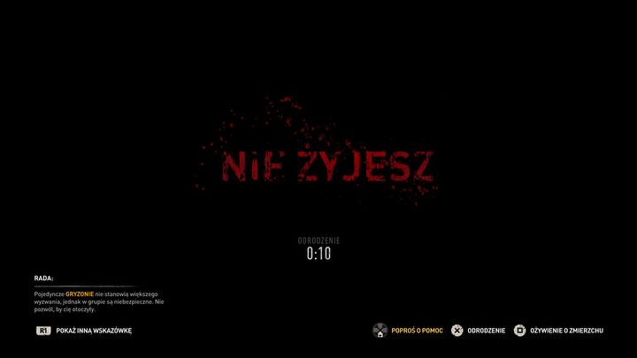 Już tłumaczę. Jeśli w nocy (ale też za dnia) podczas eksploracji umrzecie i się odrodzicie, gra ulokuje Was w bezpiecznej lokacji z lampą UV. Nie macie wpływu na to, w którym punkcie na mapie się obudzicie – gra decyduje za Was i wybiera potencjalnie najwygodniejsze dla Was miejsca. Ma to swoje plusy, bowiem jeśli właśnie podróżujecie przez noc do mocno oddalonej lokacji związanej z misją, a nie odblokowaliście jeszcze szybkiej podróży, paralotni i generalnie słabo u Was z odpornością, to szanse są duże, że wylądujecie całkiem blisko punktu docelowego. Możecie też wybrać odrodzenie się rano.