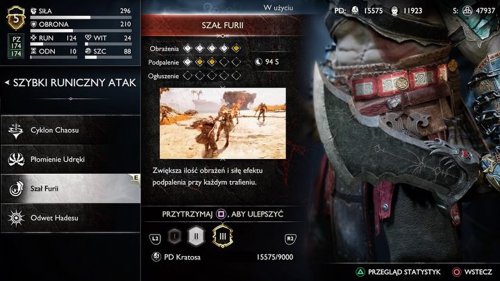 Jest jeszcze kwestia runicznych ataków – je również można zmieniać i ulepszać. Odbywa się to podobnie jak w przypadku nabywania umiejętności (i z wykorzystaniem punktów doświadczenia). Musicie tylko udać się do zakładki z bronią, wybrać odpowiadający Wam runiczny atak, a następnie przeznaczyć PD Kratosa na ulepszenie.