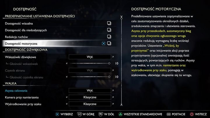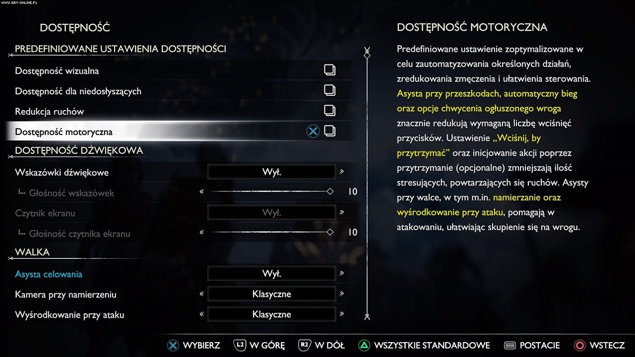 Możecie też wyłączyć kołysanie kamery, przypisać przycisk R3 do skierowywania na cel (dotyczy to zarówno zadań głównych, jak i pobocznych) czy zautomatyzować niektóre czynności. Nie wspominając oczywiście o poziomach trudności, wśród których znajduje się m.in. taki o nazwie „tylko historia”. To opcja dla tych, którzy nie chcą przejmować się walką. Podobnie jak ustawienia dostępności wybór poziomu trudności nie ma znaczenia w kontekście trofeów.