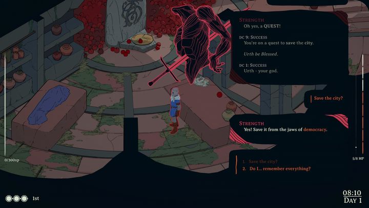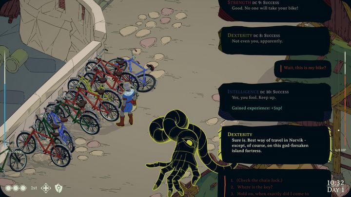 Centralnym elementem gameplayu są zaś typowo „DeDekowe” atrybuty postaci: siła, zręczność, kondycja, inteligencja, mądrość i charyzma. W Esoteric Ebb służą nie tylko temu, by je testować przy najróżniejszych okazjach – znajdowanych niemal dosłownie na każdym kroku i często tak abstrakcyjnych, że porażki bywają nawet bardziej pożądane niż sukcesy – ale również odpowiadają za typowo „discoelysiumowskie” głosy w głowie głównej postaci. I wypadają kapitalnie.