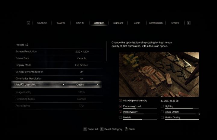 Seria Resident Evil w ogóle wyjątkowo lubi się z systemem operacyjnym Apple’a, bo nie dość, że na MacOS-ie dostępne są w zasadzie wszystkie nowe części, to jeszcze działają naprawdę przyzwoicie. Chyba najbardziej wymagający Resident Evil 4 Remake pójdzie nawet na bazowym MacBooku Pro z procesorem M1 i 8 GB pamięci RAM. W niskich ustawieniach i w 1080p oraz ze sporą pomocą upscalingu można osiągnąć spokojnie powyżej 50 fps. Na maszynie z procesorem M4 Pro i w ustawieniach ultra oraz 1080p spokojnie można przekroczyć 100 klatek na sekundę nawet w trakcie intensywnych walk.
