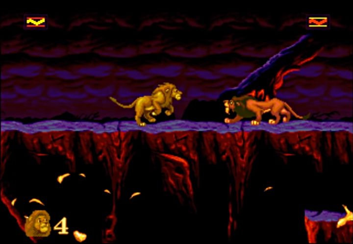 Tchórzliwy Skaza lubił unikać walki z Simbą i uciekał gdzieś poza ekran, a wtedy gracza czekały trudne sekwencje platformowe, wymagające trafiania w punkt, by uczepić się małego kawałka skały i nie zaliczyć upadku w przepaść. Poza tym po drodze czaiły się hieny, zadając dodatkowe obrażenia. Trzeba było więc nie tylko kilkakrotnie gonić przeciwnika, ryzykując zgon, ale i zachować odpowiednią ilość sił na bezpośrednią walkę. Jak na disnejowską bajkę dla dzieci było to wyjątkowo ciężkie zadanie.