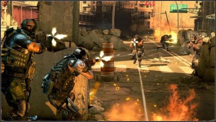 Podobnie będzie w przypadku zakładników. Mianowicie żołnierze Jonaha będą nieustannie penetrować upadający Szanghaj w poszukiwaniu mieszkańców, którzy nie do końca zgadzają się z linią programową nowego pana i władcy. Ci, przetrzymywani, przesłuchiwani i torturowani, będą czekać na ratunek. Ten oczywiście ma szanse nadejść, z drugiej strony uważanie na postronnych widzów nigdy nie było domeną dwójki bohaterów Army of Two. Dlatego też wrzucenie kilku granatów do dziupli zajętej przez wrogów, trzymających w niej kilkoro zakładników nie zostanie w jakiś szczególny sposób skarcone. Rios i Salem otrzymają nawet za taką akcję dodatkowe pieniądze i nagrody. Uzyskane w ten sposób bonusy będzie można wymieniać na akcesoria do broni (tłumiki, celowniki laserowe itd.), barwy maskujące czy też inne grafiki (podobnie będzie można „upiększać” maski bohaterów), a kasę przeznaczać na modyfikację spluw. Zwiększymy tym samym wpływ danej giwery na wzrost wskaźnika Aggro – znany z części pierwszej pasek, mówiący o tym, na którego z bohaterów wrogowie zwracają baczniejszą uwagę – a także na precyzję, łatwość obsługi czy też siłę rażenia. Oczywiście przy odrobinie wysiłku wspomnianych nieszczęśników będziemy mogli uratować – także za to otrzymamy wynagrodzenie, a może nawet wpadnie jakieś ciekawe Osiągnięcie lub Trofeum. Twórcy postanowili dać nam jednak wybór bez większych ograniczeń i za to im chwała.