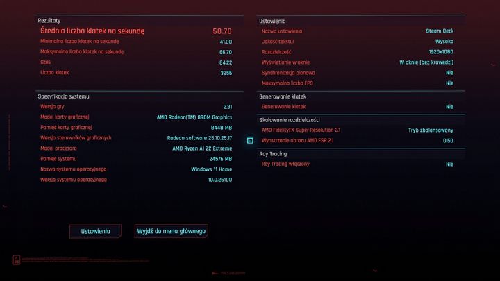 Narzędzie wydajności wbudowane w grę CD Projekt RED pozwala łatwo oszacować wydajność poszczególnych urządzeń. Nasz dzisiejszy bohater w natywnej rozdzielczości na graficznym presecie przygotowanym pod Steam Decka może pochwalić się widocznym wzrostem wydajności względem poprzedniej generacji, zbliżając się powoli do magicznej granicy 60 klatek. Zdołał również delikatnie wyprzedzić konsolę od Valve, operującą w niższej rozdzielczości.