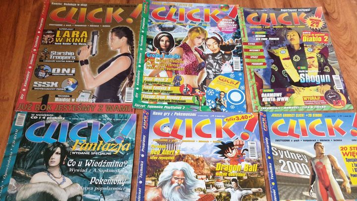 Click! to już magazyn, który startował ze świeżej pozycji i symbol nowych czasów. Nie miał korzeni w dyskietkowym, 8-bitowym okresie królowania pirackich kopii, choć pierwszą naczelną była Aleksandra „Krupik” Cwalina z Secret Service’u. Pojawił się w 2000 roku, gdy dostęp do internetu stawał się coraz powszechniejszy, a płyta CD dołączana do czasopisma była czymś oczywistym. W Clicku! widać było dość podobny styl do innych magazynów wielkiego wydawnictwa Bauer i czuło się nieco bardziej młodzieżowy klimat. Generalnie było bardzo kolorowo, przystępnie i łopatologicznie dla początkujących, były naklejki i gadżety, które zapewne przyciągały młodszych fanów gier.