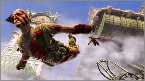 Nie to jednak zaważyło na tym, że zebrani na prezentacji widzowie oglądali przedstawienie z szczękami wbitymi w parkiet. Największe wrażenie budziła łatwość, z jaką bohater poruszał się po podniebnym mieście. Wolność nieznana z poprzednich BioShocków gra tu pierwsze skrzypce – DeWitt może nie tylko biegać po kolejnych lokacjach, ale i swobodnie przemieszczać się pomiędzy nimi za pomocą sieci specjalnych rusztowań, będących de facto połączonymi ze sobą szynami. Nasz śmiałek wykorzystywał te ostatnie, by wydostać się z obławy, by móc zaatakować wrogów z wyżej położonych miejsc, by wreszcie zmusić przeciwników do wszczęcia pościgu, bo ci, podobnie jak sam Booker, również mają na wyposażeniu haki umożliwiające podniebne przejażdżki. Najbardziej efektowne sceny podziwialiśmy, gdy detektyw próbował dostać się na latający wokół Columbii sterowiec. Prowadzący prezentację zdrowo się nakombinował, żeby zbliżyć się do zeppelina – musiał m.in. ominąć przesuwające się po szynach kontenery. Cała rozgrywka była piekielnie dynamiczna i zadziwiała dużym poziomem swobody. Po pokazie dały się słyszeć glosy, że wszystko było po prostu doskonale wyreżyserowaną sekwencją, ale nie chce mi się wierzyć, żeby zostało to zaprogramowane. Pewne jest jedno – jeśli tak będzie przedstawiać się walka w Columbii, to będziecie ją prowadzić z pozycji kolan. Jest po prostu tak dobra.