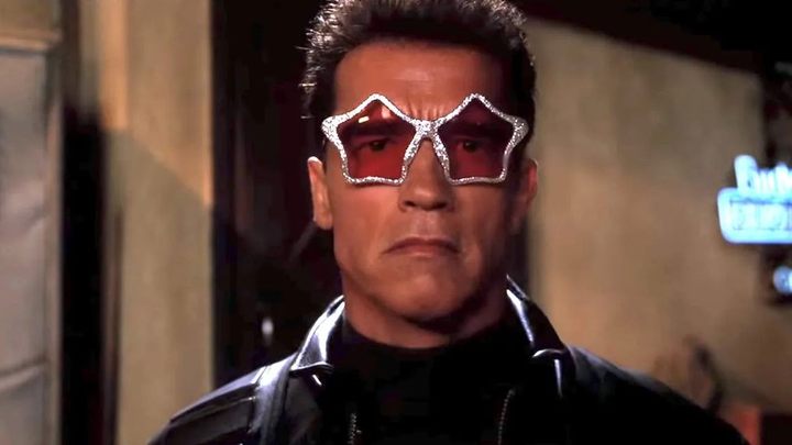 Sposób ubierania się, który zupełnie nie pasował do wizerunku T-850, to tak naprawdę tylko mały, nie tak istotny szczegół, składający się na spadek formy tej postaci w trzeciej części Terminatora. Pomijając już fakt, że fabularnie sama jego obecność nie do końca jest uzasadniona, grający go Arnold Schwarzenegger parodiuje tu po prostu samego siebie. Bo trudno to inaczej nazwać – zwłaszcza w scenie w klubie ze striptizem, w której reżyser zmusza go do założenia kiczowatych okularów z gwiazdkami (wtf?) i rzucania na prawo i lewo niby żartobliwych, ale tak naprawdę zupełnie nieśmiesznych komentarzy.