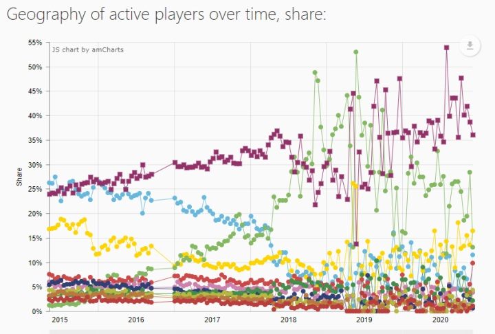 Serwis SteamSpy, zbierający dane o zbycie gier na Steamie, nie udostępnia, niestety, liczby sprzedanych kopii gier z podziałem na państwa, ale posiadaczom płatnego konta umożliwia sprawdzenie liczby graczy aktywnych danego dnia według ich narodowości. Poniżej możecie obejrzeć wykres tej statystyki dla Wiedźmina 3. Zielona linia to Chiny, niebieska USA, a fioletowa to pozostałe, mniejsze kraje. W szczytowych momentach Chińczycy stanowili ponad 50% grających!