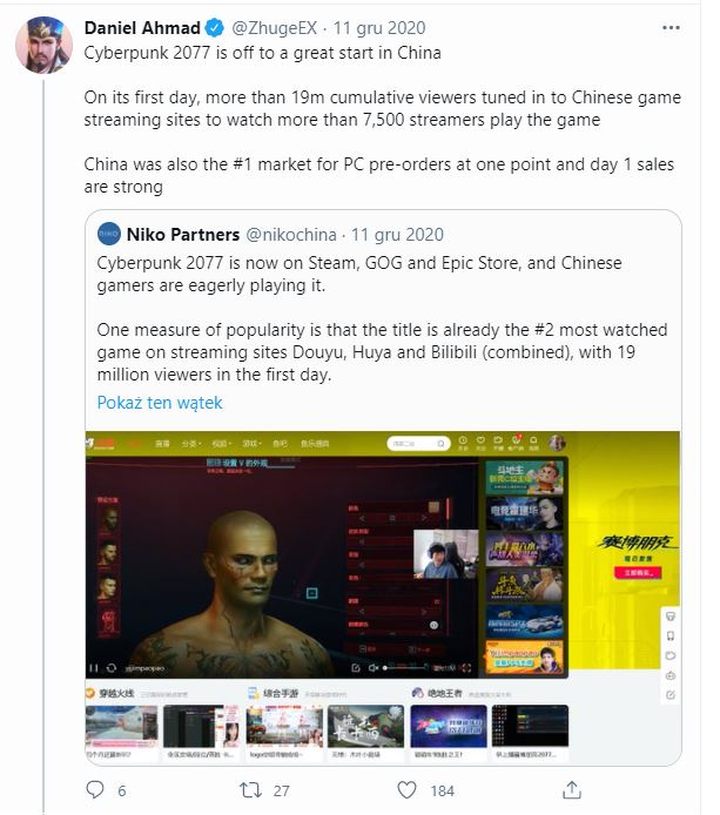 Pewnym źródłem informacji był również usunięty już wpis na LinkedIn jednego z pracowników CD Projektu. Informował on, że w pewnym momencie liczba pre-orderów Cyberpunka 2077 w Chinach była najwyższa na świecie. Wiemy też, że na chińskich platformach streamingowych Cyberpunka 2077 w dniu premiery oglądało ponad 19 milionów widzów.