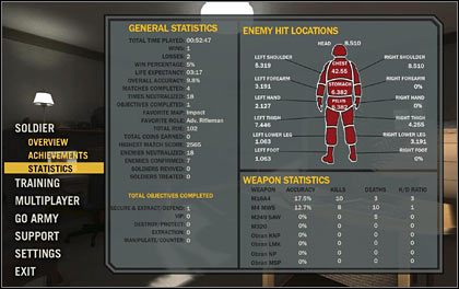 Coś, czego brakowało w poprzedniej wersji, pojawiło się w końcu w AA3. Statystyki. Osiągnięcia, na które składają się wstążki, medale i tzw. monety. Niektóre z nich możemy otrzymać np. po wygraniu rundy przy przewadze liczebnej przeciwnika, trafieniu pięć razy wroga w głowę czy – jedna z najmniej spotykanych sytuacji – rzuceniu się na granat, by w ten sposób uratować przyjaciela z drużyny. Oprócz tego, system zlicza trafienia w różne części ciała, a te możemy później przeglądać w profilu. Niestety nic nie jest doskonałe i często wprowadzone zostają błędne dane lub są one w ogóle pomijane.