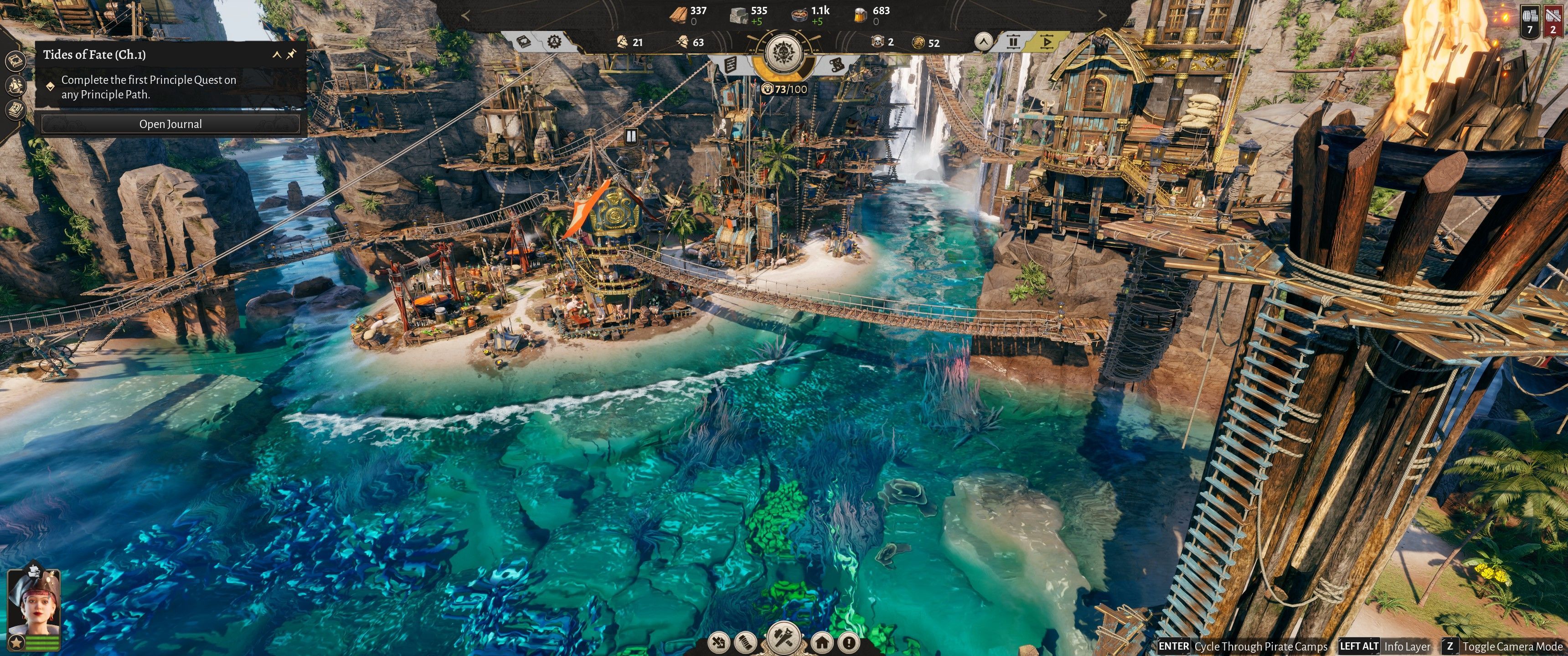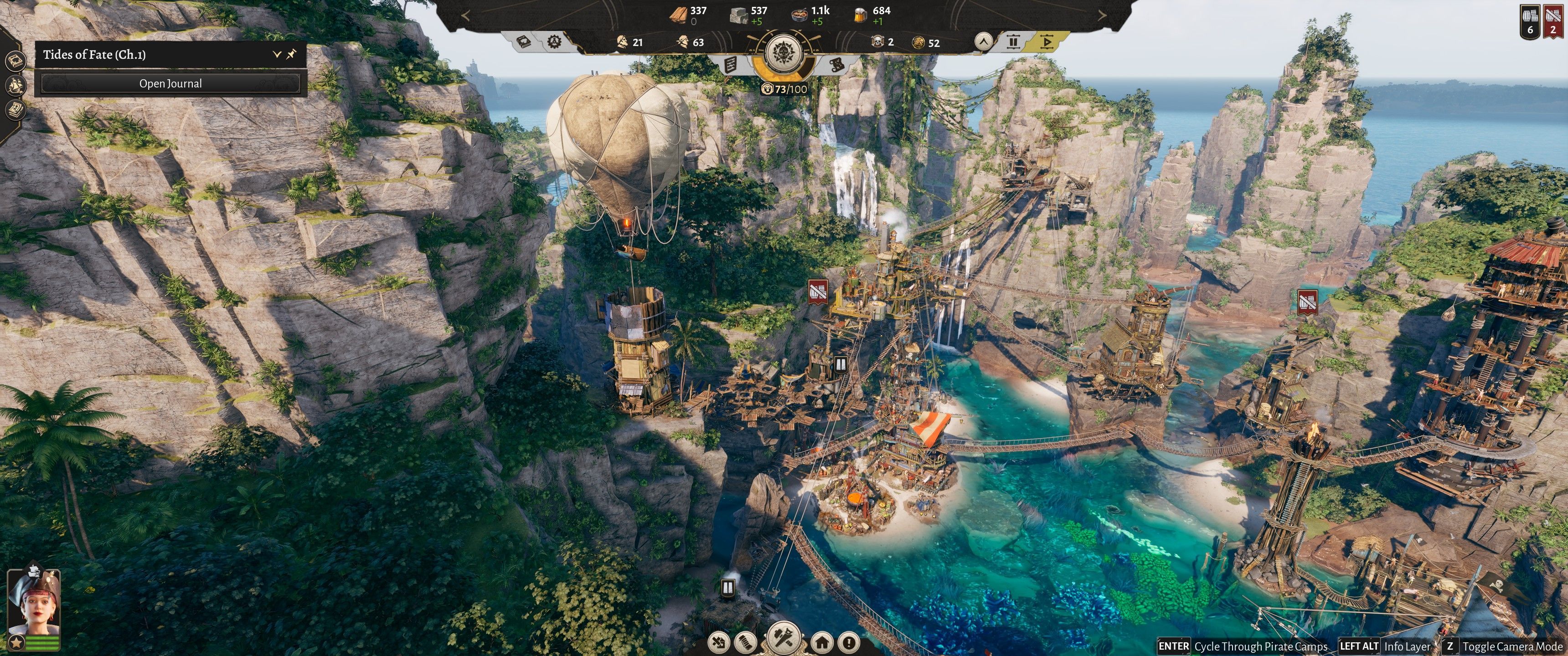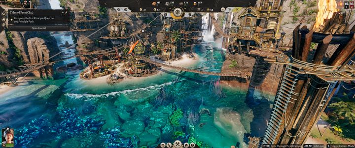 Całe to budowanie w Corsair Cove prezentuje się fantastycznie – nie przypominam sobie żadnej gry o budowaniu obok Anno, która robiłaby takie wrażenie oprawą graficzną. Skały, porastająca je roślinność, plaże i żyjące dno zatoki czy w końcu same budynki zawieszone nad przepaścią i połączone drewnianymi, linowymi mostami mogą się podobać, ale nie tylko o samą prezencję tu chodzi, a o fakt, że to działa. Bo tak po prawdzie, nie sądziłem, że to się uda – budowanie na pionowych ścianach i łączenie tych budynków kładkami, mostkami i linami? Wyobrażałem sobie chaos, który z pewnością stworzę, a który uniemożliwi mi optymalizację łańcuchów produkcji w moim wiecznie zdrowo nawalonym, pirackim miasteczku.