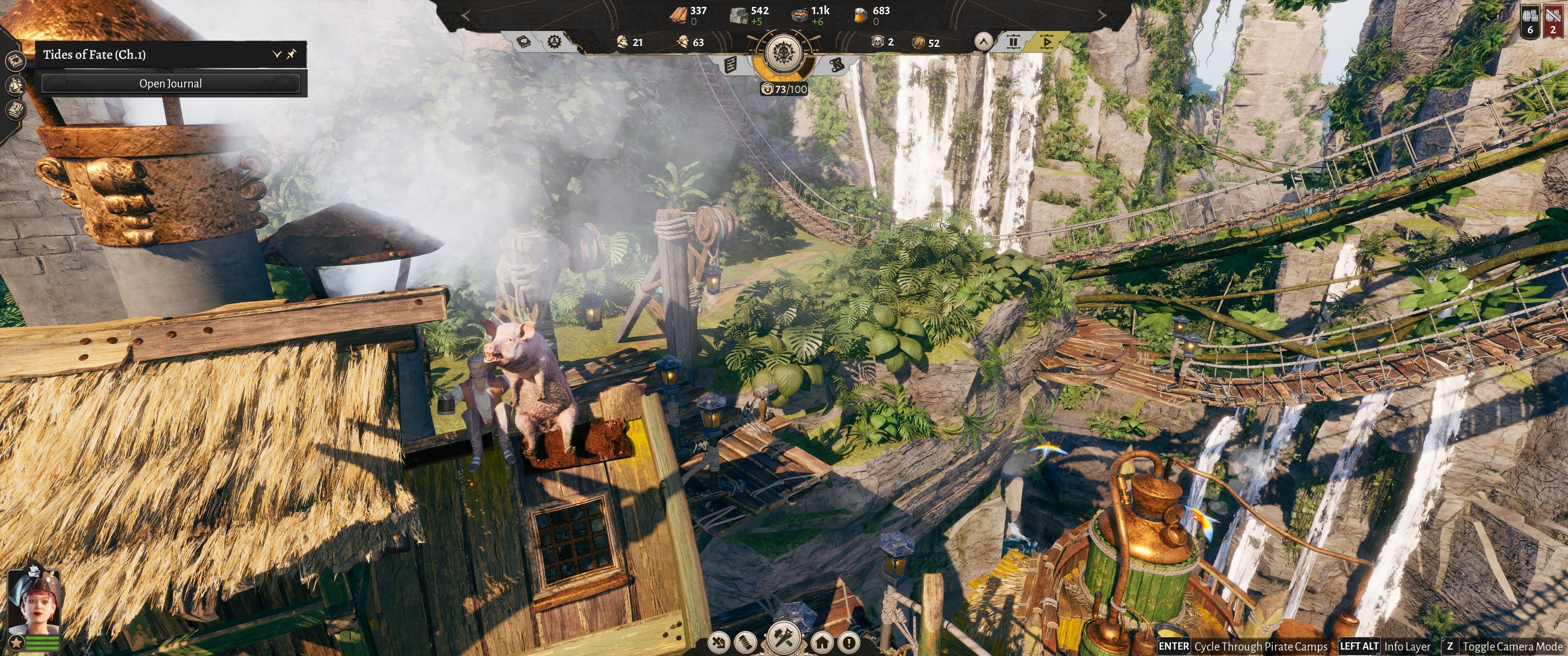 Sama warstwa artystyczna została wykonana bardzo dobrze, a piraci przypominają stereotypowych piratów z naszej wyobraźni. Są wiecznie narąbani i z jakiegoś powodu wdają się w nazbyt bliskie kontakty z trzodą. Serio – na dachu tawerny siedzi pirat ze świnią. W innym miejscu tańczy ze świnią na stole. A w jeszcze innym świnia pływa w kadzi alkoholu. Po co, nie wiem, ale dobrze oddaje to ducha produkcji. Domki są więc kolorowe i ciekawe, a na mostkach pojawiają się małe ludziki, które zajęte są tym, czym zajęci są prawdziwi piraci w swojej tajnej pirackiej bazie – darciem mordy i piciem piwa.