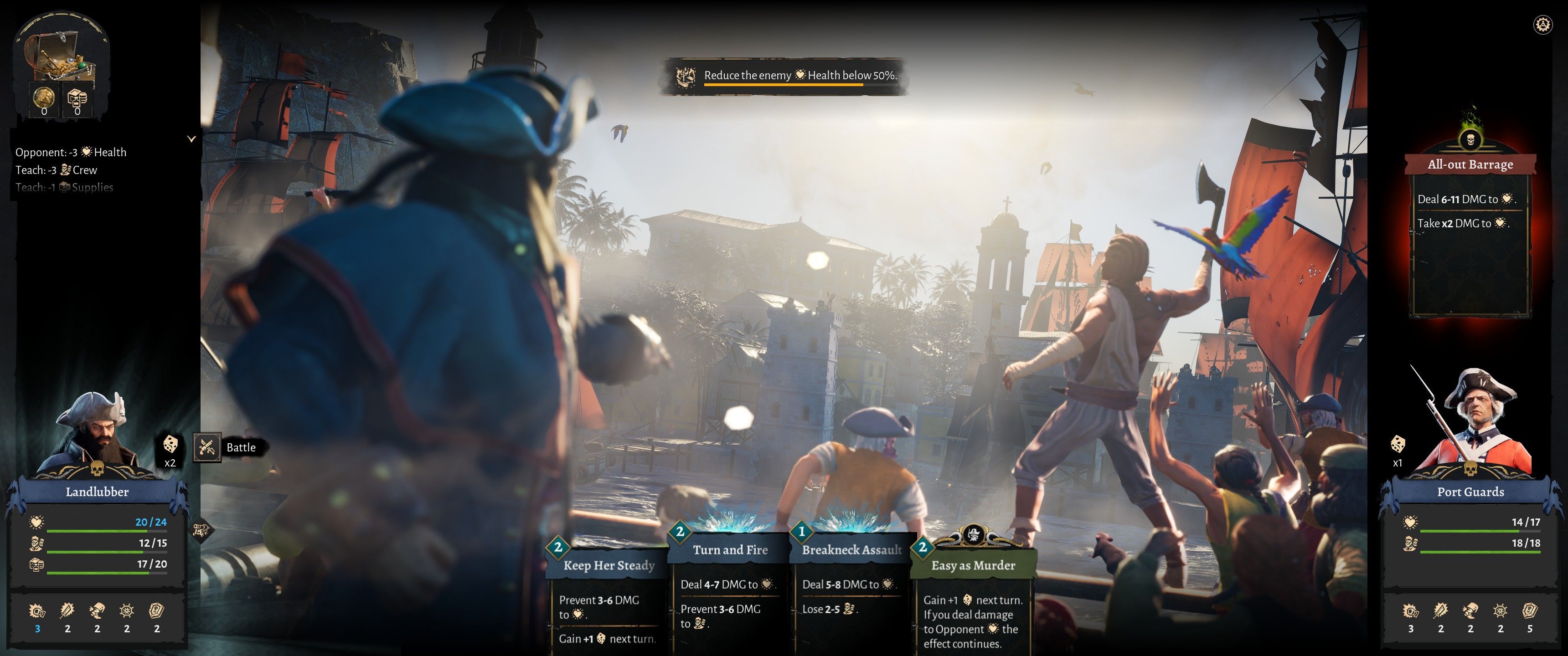 Są tu również statystyki – te kapitana jak i samej załogi, które rzeczywiście wpływają na siłę poszczególnych zagrań. Minigierka jest zazwyczaj fabularyzowana i podzielona na kilka etapów. Obejmuje ona każdą aktywność w czasie eksploracji, czyli będziecie rozgrywać karty zarówno atakując statek, plądrując miasto czy wyławiając skarb z rozbitego statku. To nie żaden Hearthstone i Magic The Gathering, ale prosta minigierka, która zastępuje walkę.