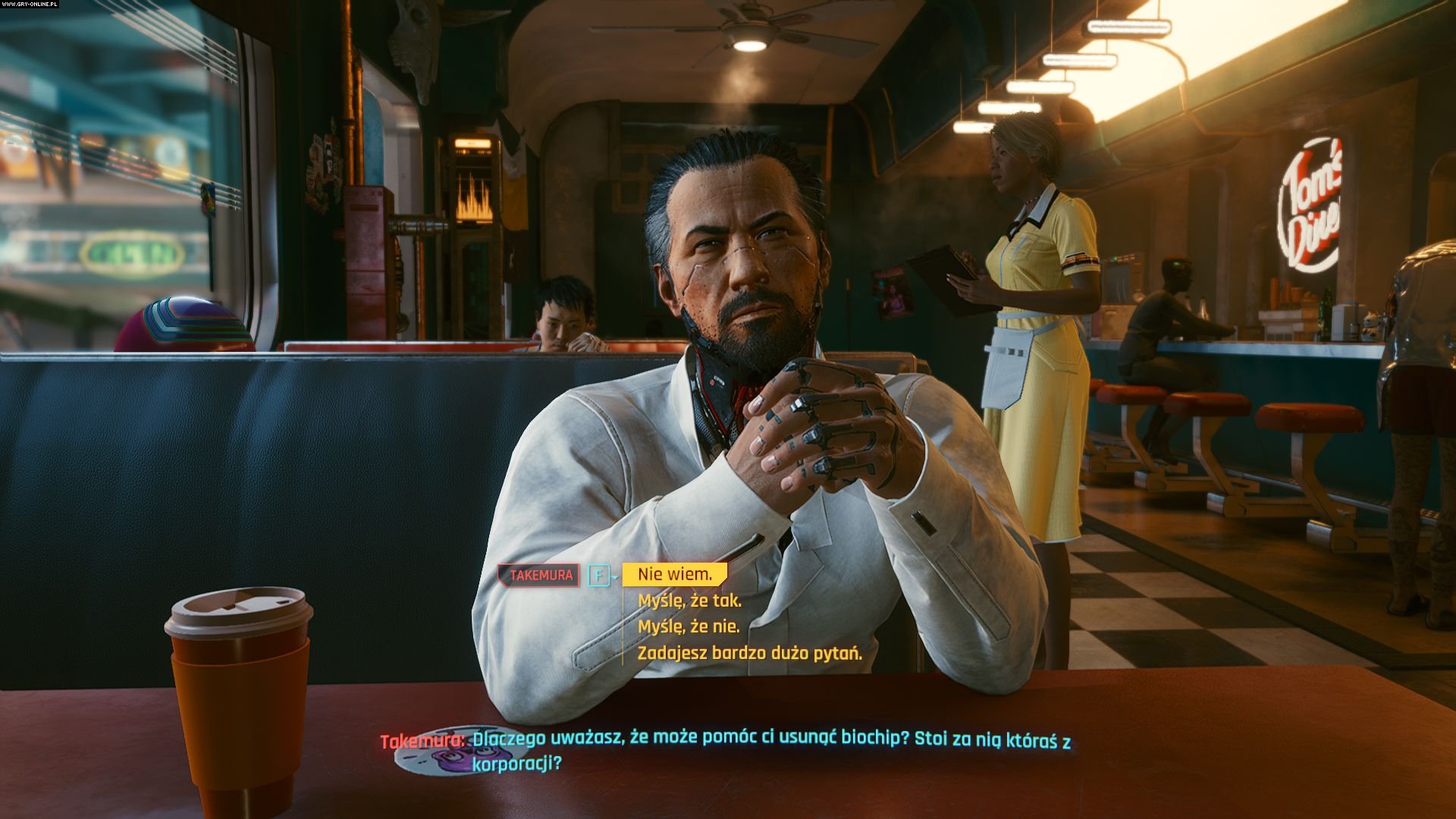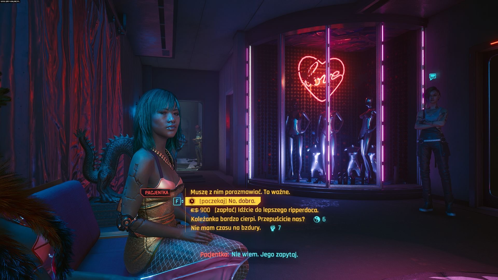 Śmialiśmy się z Fallouta 4 i jego schematu „tak”, „nie”, „nie wiem”, „sarkazm” – a przecież w Cyberpunku dostępne opcje dialogowe nierzadko sprowadzają się do „nie” i „nie” albo „tak” i „tak”. Rozmowy zwykle zmierzają do z góry ustalonej konkluzji. A już na pewno próżno szukać tu czegokolwiek choćby zbliżonego do rozwlekłych debat, które okazjonalnie toczymy w serii Deus Ex. Dobrze, że studio CD Projekt RED uwzględnia chociaż perswazję i od czasu do czasu daje nam szansę uniknięcia rozlewu krwi dzięki odpowiedniemu poziomowi któregoś atrybutu (to znaczny postęp względem Wiedźmina 3).