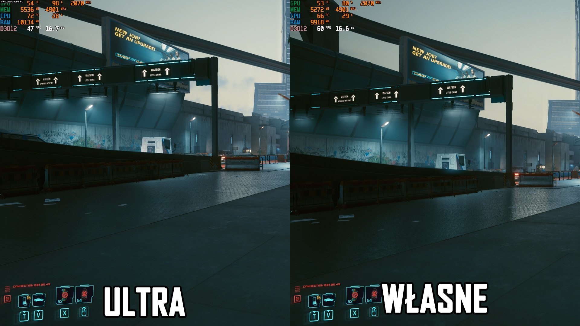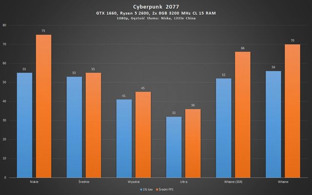 Uzyskanie 60 FPS w Cyberpunk 2077 graniczy z cudem na średniej klasy sprzęcie. Pomimo tego, że bardzo się do tej granicy zbliżyliśmy, nie ma mowy o stałych 60 FPS. Mankamentem jest zarówno sama karta graficzna, jak i procesor. To albo po prostu optymalizacja Cyberpunka 2077 nie stoi na najwyższym poziomie. Ustawienia niskie wcale nie gwarantują odpowiedniej płynności wyświetlanego obrazu, a wyglądają nieproporcjonalnie gorzej do tego, czego wymagają od sprzętu.