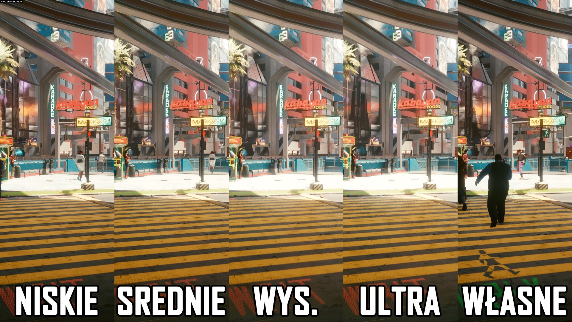 Wersja 1920x1080 60 FPS w Cyberpunk 2077 wymaga obcięcia detali do prawie minimalnego poziomu. Gra nie wygląda wtedy jak należy, a jedyna opcja, która stoi na przeszkodzie, by efekt ten uzyskać, odpowiada za odbicia przestrzeni ekranu. Musisz więc zdecydować. Grać w stałych 30 FPS ze wszystkimi efektami, czy w prawie 60 FPS bez nich. Jeżeli nie przeszkadza ci ziarnisty wygląd odbić w grze, zalecam korzystać z ustawienia niskiego – w ten sposób nie pozbywasz się w całości efektu, a po przybliżeniu odbicia wyglądają już znacznie lepiej. Dobrą wiadomością natomiast jest to, że tekstury, czy ogólnie assety pozostają niezmienne. Oznacza to, że całość utrzymana będzie na bardzo podobnym poziomie, jeżeli akurat nie będziesz rozglądał się za odbiciami.
