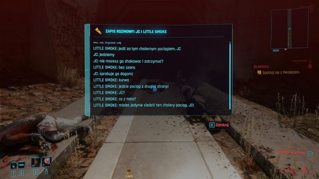 „Miałeś tylko śledzić ten cholerny pociąg, CJ” – zapewne grający niegdyś w GTA: San Andreas przeczytali to zdanie, słysząc w głowie wkurzony głos Big Smoke’a. Cóż, wyobraźcie sobie, iż do podobnej sceny doszło również w Cyberpunku, choć w nieco bardziej tragicznym wydaniu. Nieopodal Night City przy torach kolejowych znajdziecie bowiem ciała dwóch facetów, Little Smoke’a oraz JC (ekhem, subtelne te przeciwieństwa imion), a przy nich zapis rozmowy, z którym możecie zapoznać się na powyższym obrazku. Nic chyba nie muszę dodawać.
