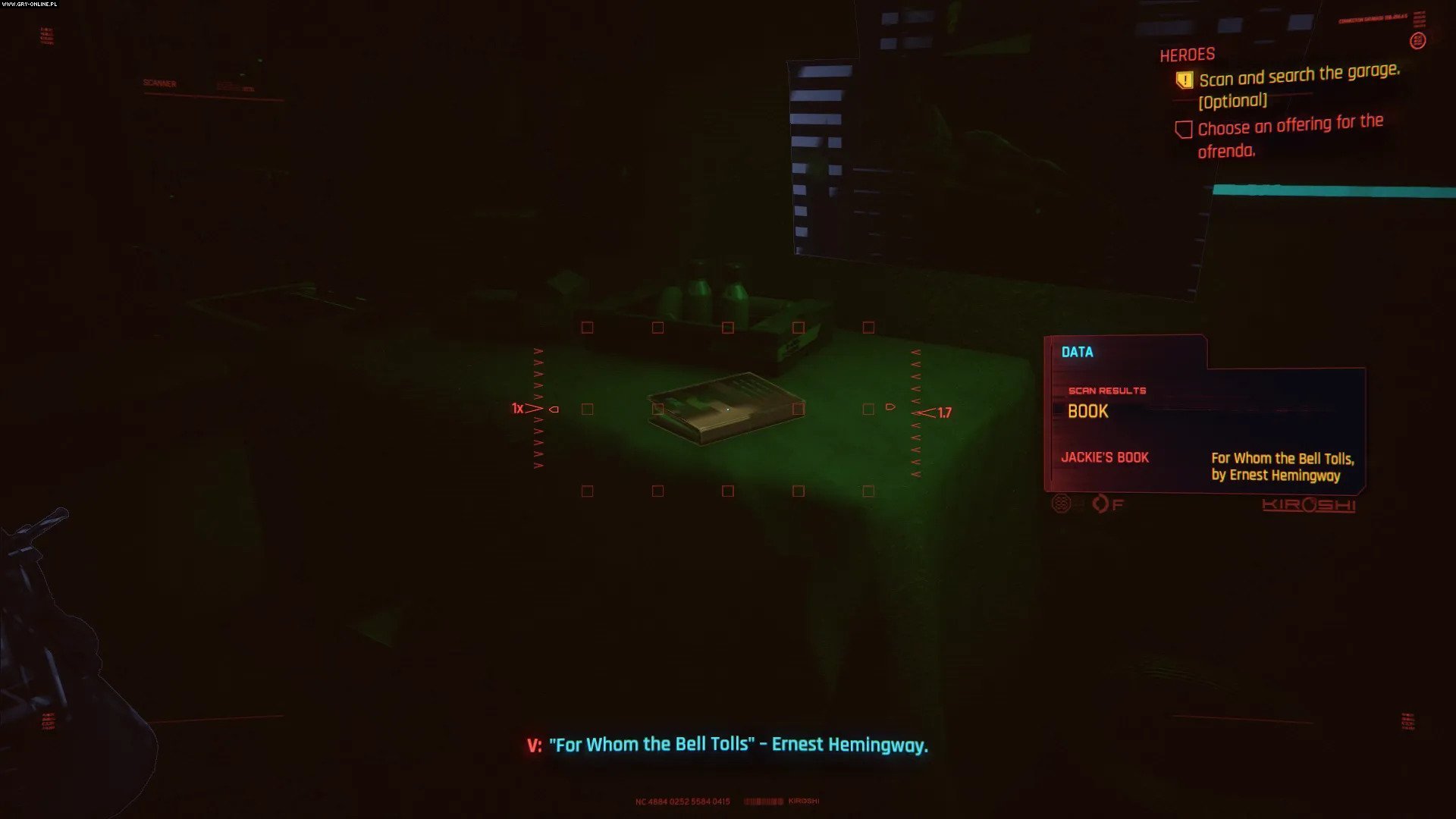Sam Jackie nie był jednak takim prostakiem i luzakiem, za jakiego się podawał, i zdarzało mu się obcować z literaturą. Przekonujemy się o tym w trakcie misji „Widzimy się w Afterlife”, podczas której przygotowujemy się do pogrzebu naszego przyjaciela. Przeszukując jego garaż, znajdujemy między innym książkę Ernesta Hemingwaya pod tytułem Komu bije dzwon, a Misty potwierdza, że Jackiemu zdarzało się ją czytać. Co ciekawe finałowe zadanie w Cyberpunku 2077 ma tę samą nazwę co wspomniana powieść. Przypadek? Nie sądzę.