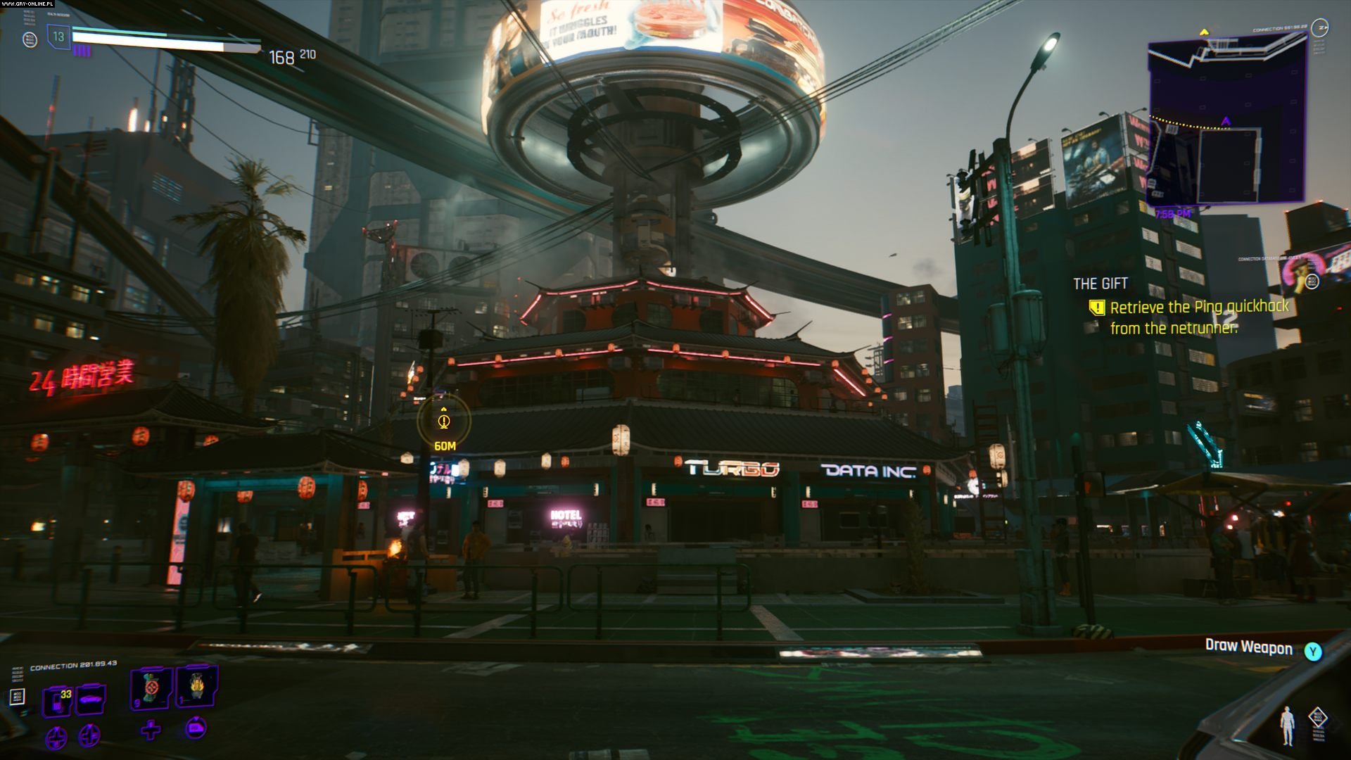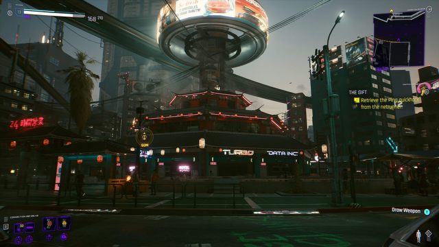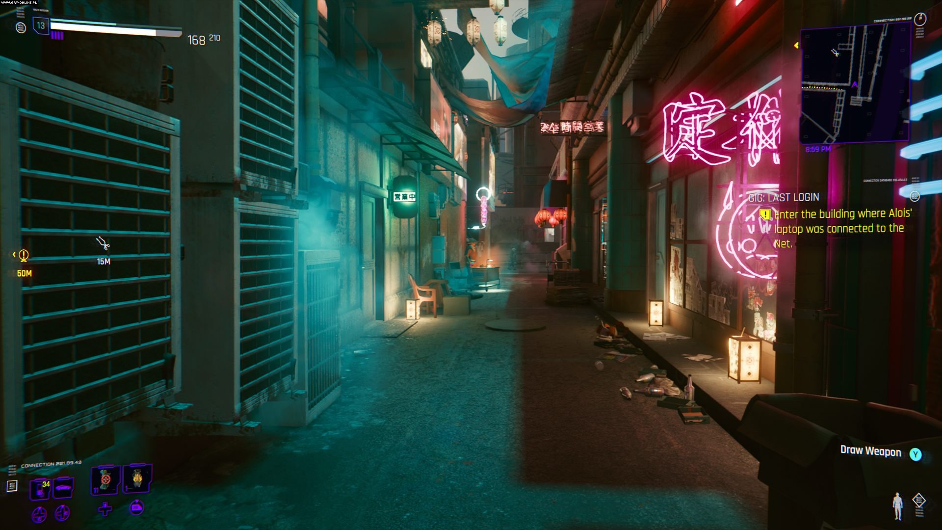 Night City to jednak nie tylko gigantyczne budowle, to także małe, niepozorne lokacje. Jedną z moich ulubionych jest okrąglak w Kabuki. Nie dość, że on sam stanowi śliczny mały ryneczek, to obok, w bramie, mieści się drugie minitargowisko, a przy nim hotel. Możecie go minąć dziesięć razy, a potem dostaniecie misję, w której się okaże, że do pokoju na drugim piętrze da się wejść na przynajmniej trzy sposoby i zabić nasz cel albo przekonać go do naszych racji. Chodziłem wczoraj po okolicy, trafiłem do paru niepozornych zaułków, do przejścia podziemnego między dolnym poziomem okrąglaka a wspomnianym minitargowiskiem, a przy okazji złapałem misję.