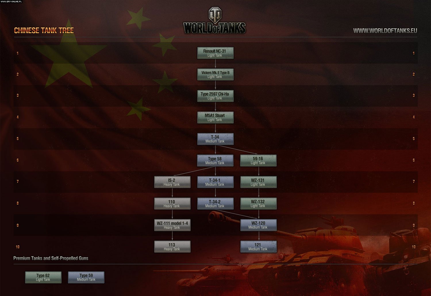 Właściwości jezdne nowych czołgów średnich są zbliżone do tego, co proponują wytwory radzieckiej myśli technicznej, jednak istnieje między nimi pewna zasadnicza różnica. „Chińczyki” lubią duże armaty. Począwszy od poziomu ósmego, pojazdy takie jak T-34-2, WZ-120 (zwykły Typ 59 uzbrojony w lepszą armatę) oraz 121 mogą zamontować działo o kalibrze 122 mm, dzięki czemu zadają największe obrażenia ze wszystkich czołgów średnich w grze: dobre trafienie potrafi spowodować nawet 550 punktów uszkodzeń! Wady? Ich maksymalny stopień wychylenia lufy w płaszczyźnie pionowej jest niewielki, co znacznie utrudnia starcia w górzystym lub pagórkowatym terenie.