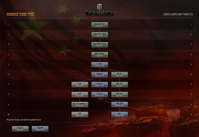W szeregach kolejnych dwu grup spotkamy tylko prototypy (określane liczbą) oraz maszyny, które dotarły do stadium testów (ich nazwy zawierają przedrostek „WZ”). Są to zarówno lekkie oraz średnie, jak i ciężkie czołgi o dziwnie brzmiących mianach, np. WZ-131, WZ-120, 113 czy 59-16. Ostatnią kategorię stanowią pojazdy, które przeszły pomyślnie wszystkie testy i brały aktywny udział w służbie chińskiej armii. W ich nazwach występuje słowo „typ”. Jak nietrudno się domyślić, obecne w grze czołgi premium Typ 59 i Typ 62 również należą do tej grupy.