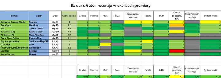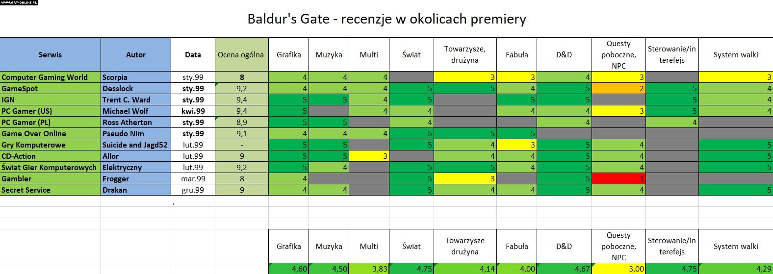 Niestrudzenie i z niesłabnącym zapałem doprowadziłem do tego, by arkusz kalkulacyjny ponownie zapłonął od nadmiaru danych, które do analizy zaczerpnąłem z ówczesnych recenzji i wrażeń dziennikarzy z całego świata. Jako że zależało mi na spojrzeniu świeżym, skupiałem się na tekstach z przełomu lat 1998 i 1999, czyli okresu premiery BG. Zważywszy na fakt, że od wydania gry minęła epoka, dostęp do wiedzy źródłowej największych i najbardziej opiniotwórczych głosów branżowych był nierzadko zadaniem karkołomnym, a materiały własne czy nawet zasoby Internet Archive – niewystarczające. Na szczęście, i ku mojemu zdziwieniu, głosów polskiej myśli żurnalistycznej odnalazłem całkiem sporo, więc ten tekst wyjątkowo sponsorowany jest właśnie przez nasze rodzime growe dziennikarstwo.