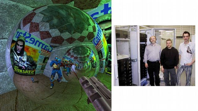 Z lewej: przykład zastosowania technologii ray tracingu w Quake III: Arena w 2004 roku. Na zdjęciu z prawej w środku: student Daniel Pohl, autor rozwiązania. Rendering został wykonany przy pomocy CPU w linuxowym klastrze komputerowym z 48 procesorami Athlon MP oraz 12 GB pamięci RAM. Pohl od 2007 roku jest związany z firmą Intel.