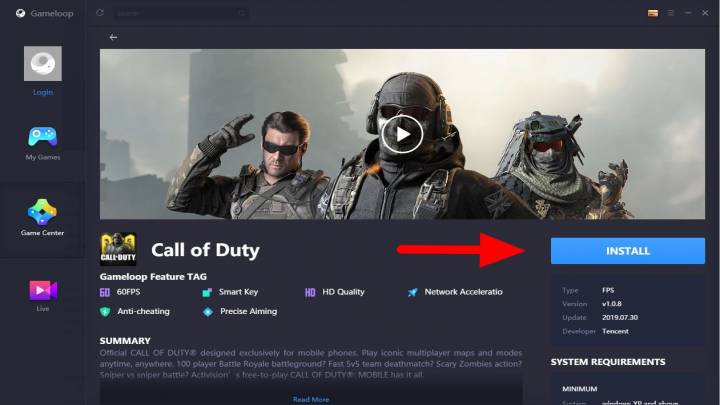 Następnie ukażą Ci się różne gry, które obsługuje ten emulator. Znajdziesz tam również mobilne Call of Duty, które należy zainstalować, klikając przycisk „Install” (spowoduje to pobranie ok. 1,50GB danych). Instalacja gry nastąpi automatycznie.