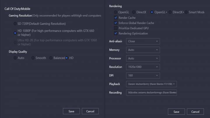 Na szczęście naprzeciw oczekiwaniom użytkowników wychodzi emulator, oferując bardziej zaawansowane menu opcji. Zmienimy tu przede wszystkim rozdzielczość gry i ustawienia renderowania. Dodatkowo otrzymujemy możliwość zmodyfikowania DPI oraz wybrania urządzeń odtwarzania i nagrywania.
