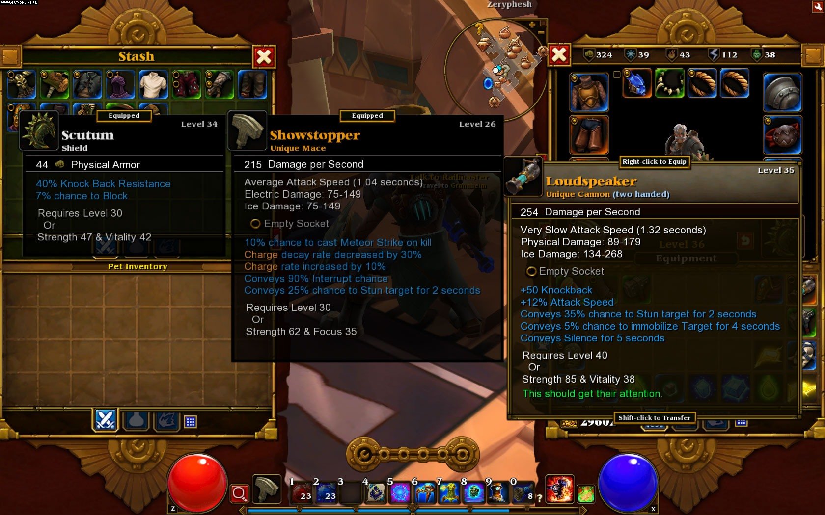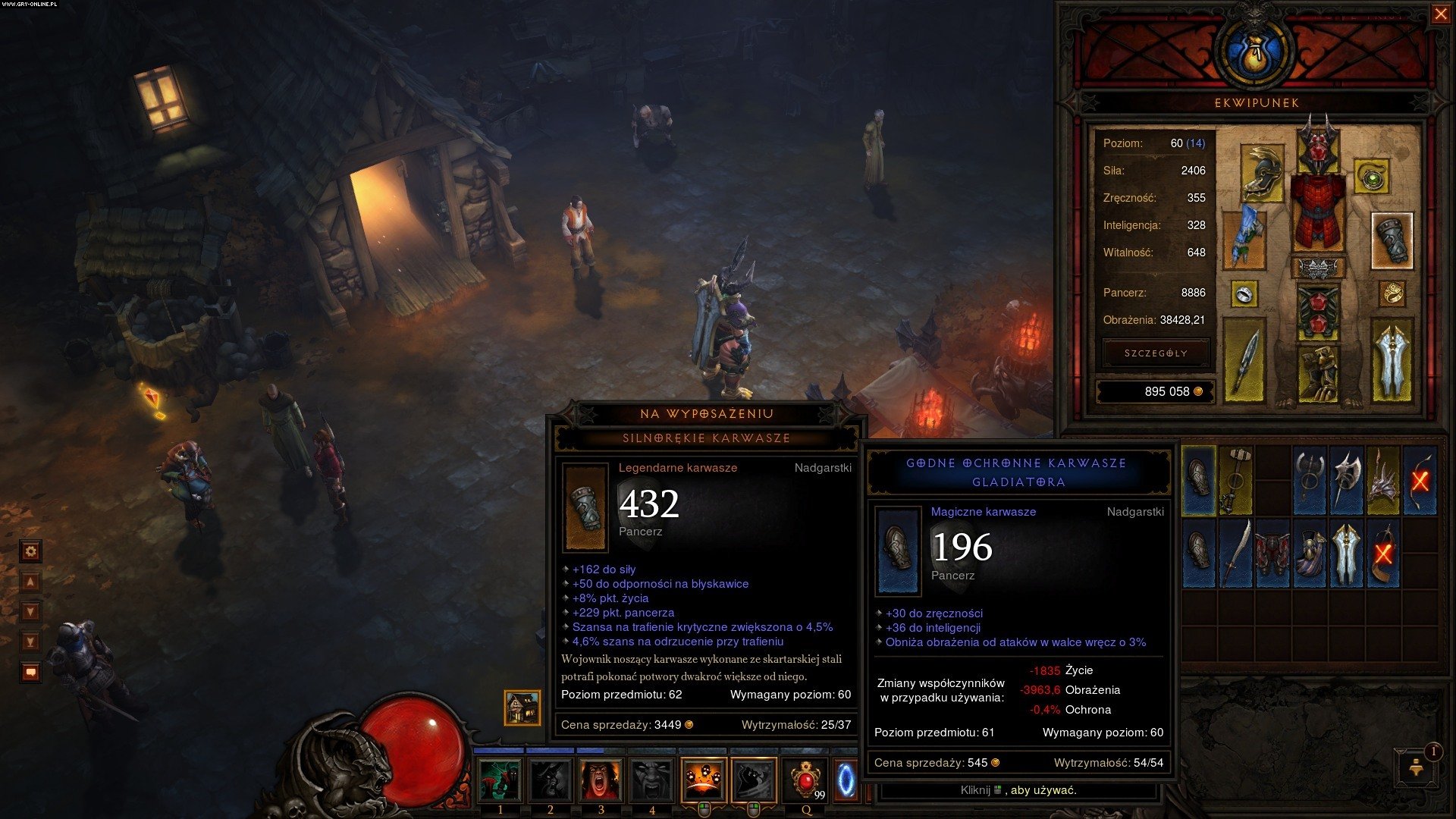 Każda gra nastawiona na losowość wypadającego z przeciwników sprzętu i chęć odnajdywania coraz lepszych jego elementów cierpi w mniejszym lub większym stopniu na efekt „ale śmieci wyleciały”. Diablo III w początkowym stadium było świetnym tego przykładem. Słabo losowane statystyki pod względem klasy postaci czy legendarne przedmioty gorsze niż rzadkie były na porządku dziennym. Kolejne łatki zdecydowanie poprawiły ten aspekt, ale wszystko i tak rozbija się o jeden, bardzo ważny element – dom aukcyjny. Wyjątkowo nie podoba mi się ten wynalazek, który wymusza kupowanie broni lub zbroi znalezionej przez kogoś innego, żeby powalczyć na późniejszych etapach, bo szanse, że podczas zabawy trafi się coś lepszego, są w zasadzie zerowe (choć postacie z wysokim atrybutem znajdowania magicznych przedmiotów mogą się nie zgodzić). Kontrowersyjna decyzja projektantów i dla mnie minus. Patrząc na to z innej strony – wygląd inwentarza w Diablo III oraz sposób prezentacji właściwości sprzętu to chyba najlepsze, co można obecnie wyciągnąć z systemu bazującego na znanym z „jedynki” szesnastoletnim już projekcie tych elementów. Przedmioty zajmują maksymalnie 2 sloty, butelki sumują się w jednym kwadraciku, a okienko porównujące statystyki broni i zbroi jest bardzo czytelne.