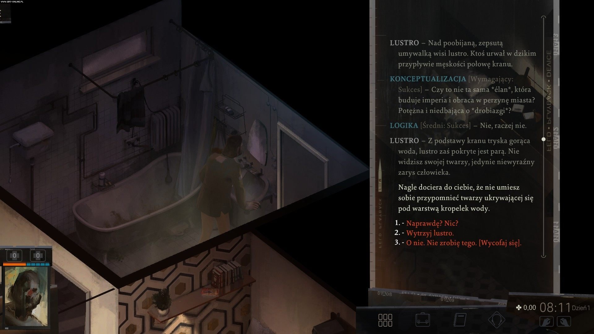 Po kilkudziesięciu minutach w grze zacząłem powoli czaić, kim mniej więcej jest mój bohater, i rzeczywiście poczułem, że to osobliwe drzewko umiejętności w pełni oddaje jego charakter i naturę. Po raz pierwszy widzimy go bowiem skacowanego, odzyskującego przytomność w samych gaciach, w brudnym, zagraconym pokoju. Od razu słyszymy, że rozmawia z własnym układem limbicznym i jakimś starożytnym gadzim mózgiem – i nagle istnienie czegoś takiego jak „wewnętrzne imperium”, czyli systemu śnienia na jawie, nabiera sensu. Elektrochemia? Cóż, nasz protagonista to pijaczyna świadomy swojego alkoholizmu, ponadto człowiek niestroniący od narkotyków – w końcu zaczynamy rozumieć, czym jest dla niego „świat imprez”. A co do „esprit de corps”, nie ma w tym nic skomplikowanego – główny bohater jest po prostu detektywem przynależącym do 41. komisariatu. Milicja jest więc instytucją, z którą związał niemal całe swoje życie.