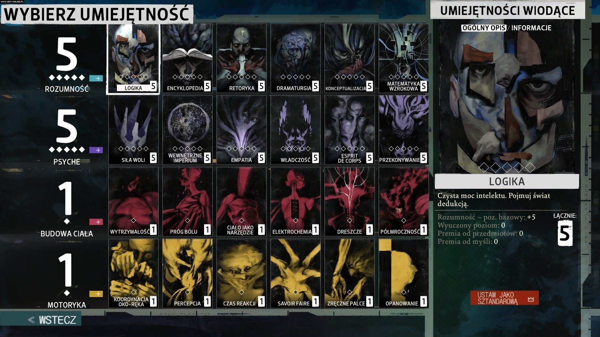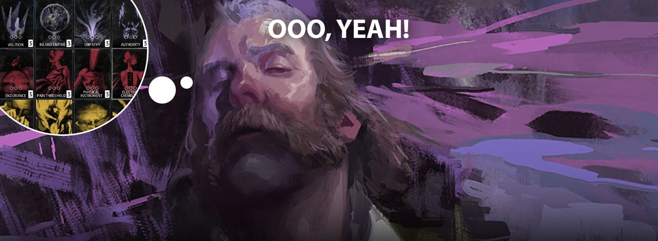 Disco Elysium może nie odwraca się całkowicie od takowego systemu, bo nadal mamy tu do czynienia z umiejętnościami, które odblokowujemy zgodnie z naszymi preferencjami przy użyciu zdobywanych za wbijanie poziomów punktów. Nie jest to nic szalenie odkrywczego. Zabawa zaczyna się jednak, gdy sprawdzimy, jakie skille możemy odblokowywać, gdyż te (przynajmniej na pierwszy rzut oka) wydają się wypranymi z sensu, nieco pretensjonalnymi określeniami – zarówno pod względem semantycznym, jak i funkcjonalnym.