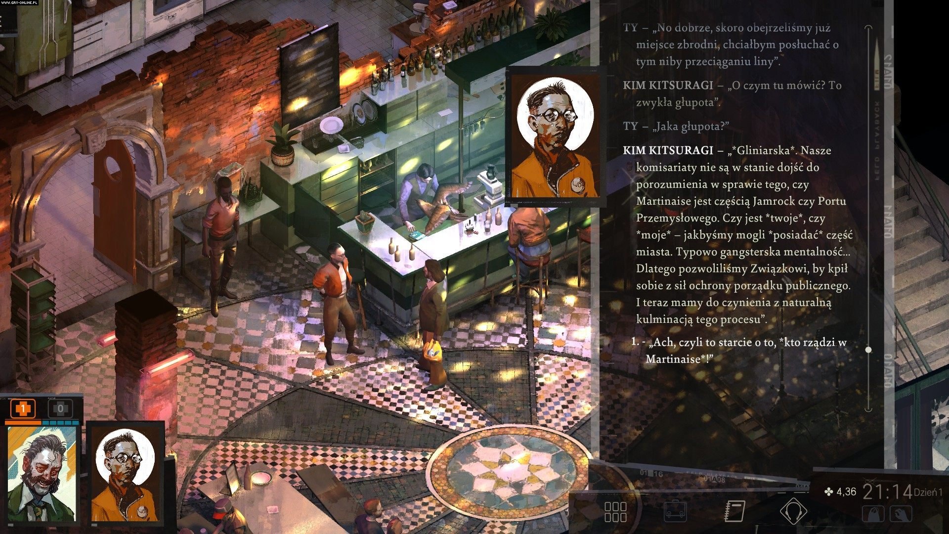 Swoje miejsce w okienku tekstowym znalazły także wszystkie atrybuty i umiejętności, o których wspominałem. I uwierzcie mi, odgrywają one tutaj kluczową rolę. Disco Elysium tak jaskrawo lśni „erpegowością” właśnie dlatego, że każda rozmowa może potoczyć się tu na mnóstwo różnych sposobów. Na kształt każdej konwersacji czy monologu wewnętrznego aktywnie wpływają rozwijane przez nas umiejętności. Przykład? Jeżeli władowaliśmy osiem punktów w empatię, to jesteśmy w stanie wychwycić, że kryjący się za pokerową twarzą Kim Kitsuragi, nasz kolega po fachu, odczuwa w danej sytuacji smutek albo radość. Taka informacja pozwala na poznanie szerszego kontekstu całej sytuacji i odblokowanie dodatkowych kwestii dialogowych, a co za tym idzie – podjęcie sensowniejszej decyzji, wypowiedzenie bardziej odpowiedniego w danym momencie zdania. Tkwi w tym jednak pewien haczyk i nieraz dałem się na niego złapać.
