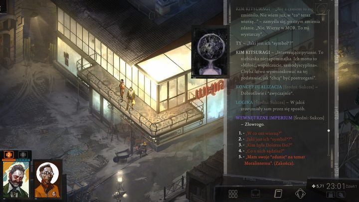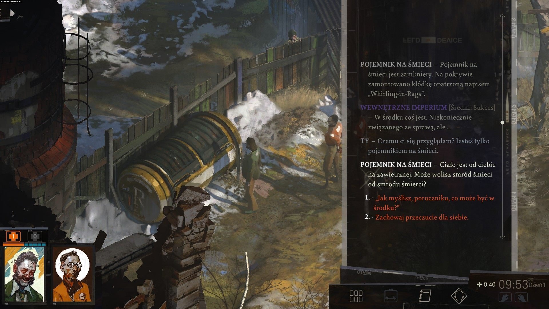 Prawdziwy potencjał owych rozwiązań uwalniany jest bowiem w dialogach, które – nie ukrywajmy – stanowią jakieś 70% treści Disco Elysium, reszta to narracja na poziomie stricte wizualnym. Bo choć nie jest to RPG, w który mamy do czynienia czy to z walką turową, czy z taką w czasie rzeczywistym, podejmujemy w nim wiele najróżniejszych akcji. I to takich opartych na rzucie kością. Sęk w tym, że wszystkie te działania są reprezentowane przez ściany tekstu i multum najróżniejszych kwestii dialogowych do wyboru. Nawet proste otwarcie śmietnika wiąże się z niemałą ilością czytania i klikania odpowiednich podpunktów.
