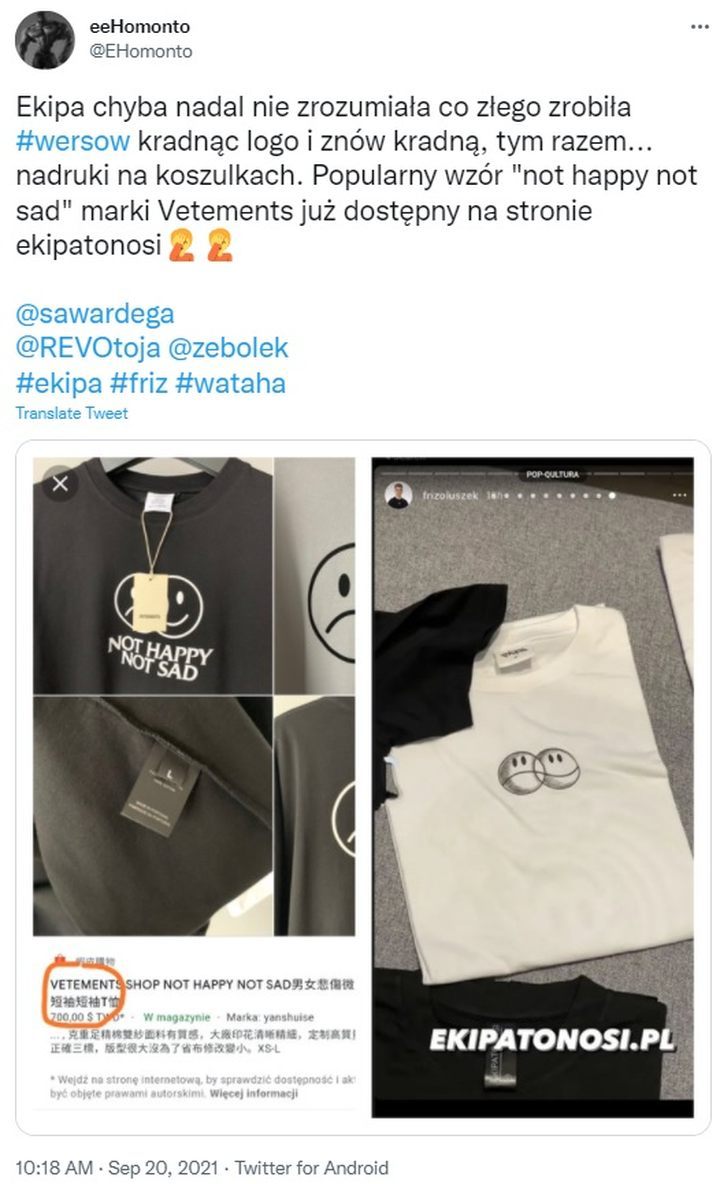 Jesienią 2021 roku okazało się, że koszulki Ekipatonosi mają nadruk bardzo podobny do tego na ubraniach marki Vetements, co zauważył użytkownik eeHomonto na Twitterze. Nie jest to idealna kopia, pomysł wydaje się dość uniwersalny, jednak pewna wątpliwość co do oryginalności wizji artystycznej pozostaje.