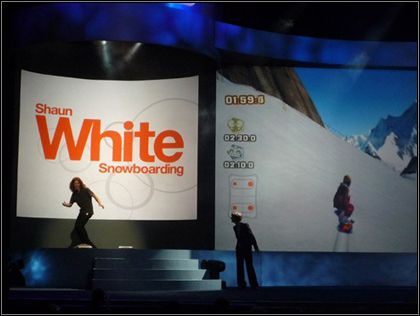 By nowo zaanonsowany hit na Wii lepiej zapadł w pamięć, na scenie pojawił się tytułowy bohater sportówki UbiSoftu, zwany (z powodu charakterystycznej czupryny) „Latającym Pomidorem” i przy użyciu deski Balance Board pokazał zgromadzonym w sali dziennikarzom, że szusowanie po wirtualnym śniegu może być równie emocjonujące, co zjazd ze zbocza Gór Skalistych. Po krótkim popisie White’a do zabawy włączyła się też Dunaway, która w towarzystwie olimpijskiego medalisty weszła na drugą deskę i usiłowała zademonstrować widzom garść nowatorskich trików. Występ a vista w wizytowym stroju nie był jednak najbardziej widowiskowy w historii świata i wkrótce uwaga wszystkich skupiła się na kolejnym bohaterze dnia, Satoru Iwacie.