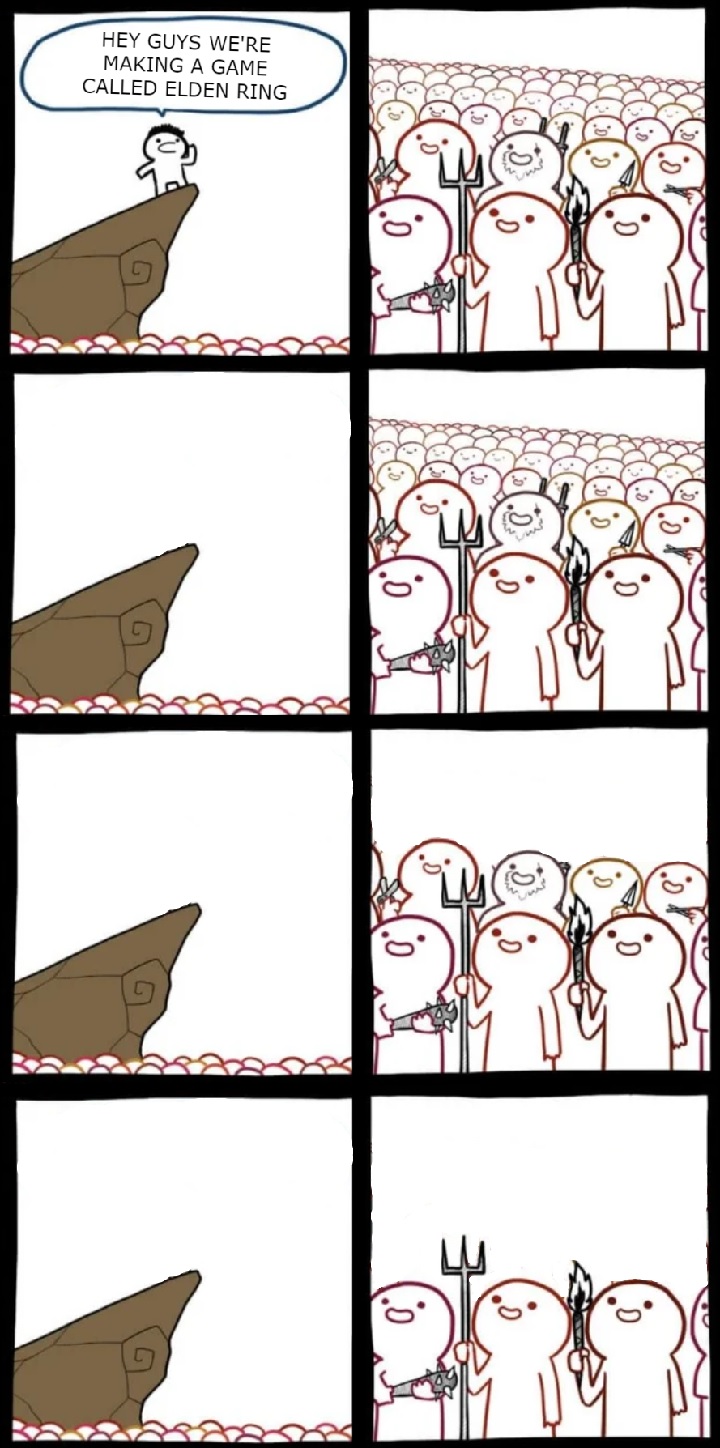Im bliżej premiery, tym częściej w sieci pojawiały się wątki poświęcone buildom postaci oraz lore’owi Ziem Pomiędzy. Tonęły one jednak w istnym morzu – by nie rzec: oceanie – internetowych memów. Fani prześcigali się w tym, kto stworzy bardziej zabawną, bardziej oddającą ich entuzjazm grafikę, wzajemnie zwiększając poziom swojej ekscytacji. Można było się spodziewać, że po wydaniu Elden Ringa zaleje nas kolejna fala memów – i dokładnie tak się stało. Nie uprzedzajmy jednak faktów, tylko prześledźmy całą dotychczasową historię najnowszego dzieła Hidetaki Miyazakiego i spółki, wyrażoną w postaci fanowskich memów. Najpierw przypomnijmy sobie, jak hype train wyruszył w podróż.