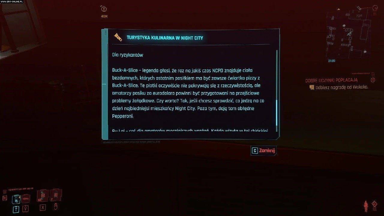 Że niby się czepiam? Być może, w końcu w innych produkcjach AAA również występują klasyczne notatki. Ale, kurczę, to są „Redzi” – deweloperzy aspirujący do miana największych w branży. W dodatku gra przenosi nas do 2077 roku; biorąc pod uwagę obecny postęp technologiczny, trudno mi sobie wyobrazić, że za pół wieku ludzie wciąż będą posługiwali się tekstem na szeroką skalę.