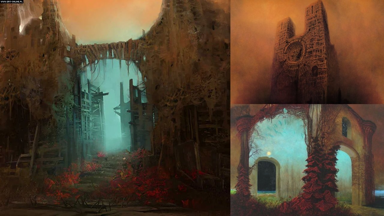 Na obrazku powyżej oraz po lewej stronie grafiki znajdującej się pod nim widzicie zrzut ekranu i concept art tej samej budowli. Reszta to już oryginalne obrazy Beksińskiego (obydwa niezatytułowane) przedstawiające inne obiekty, ale podobne pod względem architektonicznym i z charakterystycznym światłem tego samego koloru.
