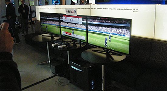 Jedno ze stanowisk do gry w FIF-ę 13 pozwalało na rozegranie spotkań w widoku podzielonym na trzy ekrany – choć ze względu na wczesną wersję kodu zdarzały się problemy z płynnością, możliwość obserwowania całego boiska robiła naprawdę spore wrażenie.