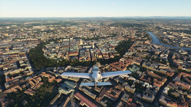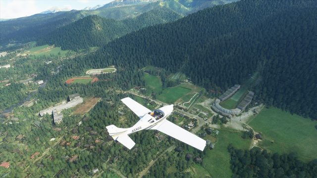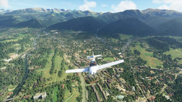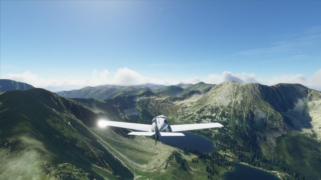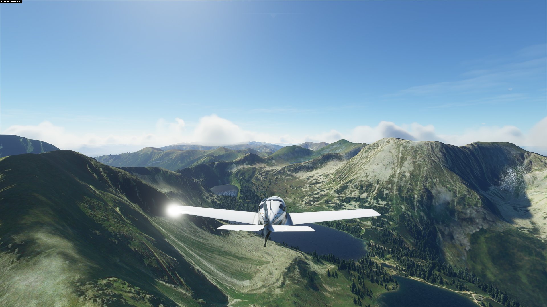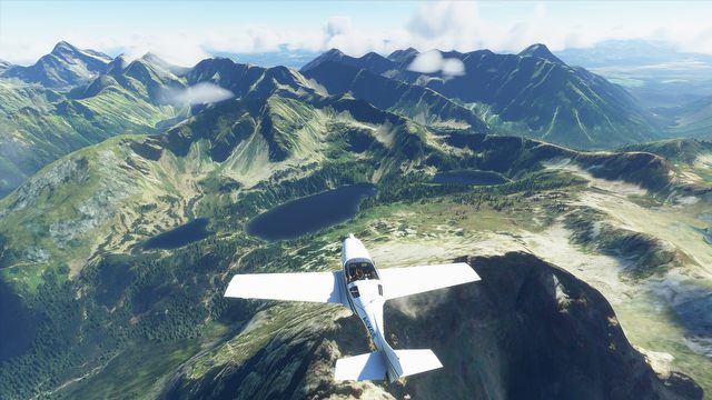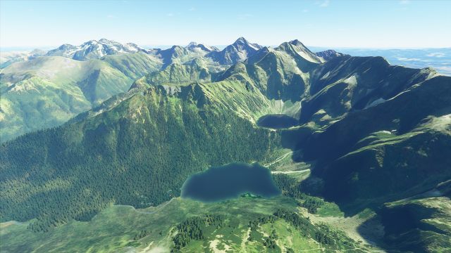 Wszystkie góry we Flight Simulatorze prezentują się bardzo dobrze. Czuć ich majestat, a tekstury są całkiem realistyczne. W przypadku Tatr mogłem umiejscowić samolot jedynie gdzieś ogólnie przy górskim paśmie, ale już mapa podczas lotu pokazała prawidłowy układ zbiorników wodnych i bez problemu znalazłem Morskie Oko oraz Dolinę Pięciu Stawów. Widać nawet drogę dochodzącą do Morskiego Oka, przy której w rzeczywistości są schroniska PTTK.