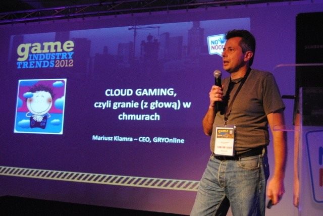 Tematyce cloud gamingu poświęcona została prelekcja Mariusza Klamry, prezesa zarządu serwisu GRY-OnLine. Rozpoczął on swoje wystąpienie od zdefiniowania pojęcia „grania w chmurze”, która m.in. pozwala na zabawę w zaawansowane produkcje także na słabszych komputerach. Wyjaśnił pokrótce historię powstawania serwisów oferujących tego rodzaje usługi – od OnLive, założonego w czerwcu 2010 roku, przez Gaikai, zakupiony niedawno przez koncern Sony, aż po świeże przedsięwzięcie firmy Square Enix (sprzed miesiąca). Następnie omówił zalety i wady takiego systemu.