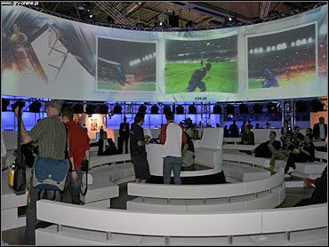 Szokuje, ale bynajmniej nie prezentowanym zakresem tytułów – który jest do bólu przewidywalny i co roku powtarzany bez większych innowacji – ale audiowizualnym przepychem swojego standa, który pod względem technologicznym był z pewnością najefektowniejszym stoiskiem targów. W specjalnie wzniesionym na ten cel ‘budynku’ umieszczono okrągłą, powoli obracającą się podłogę, wypełnioną wygodnymi kanapami, nad którą rozpostarto jeden, wielki ekran, obejmujący pełne 360 stopni widoczności, a do tego dołożono nagłośnienie wykraczające jakością poza standardy serwowane w polskich kinach. Efekt był powalający. ![]() Ciężko oddać ten efekt za pomocą zdjęcia.