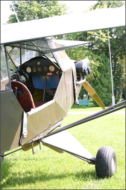Potem nastąpiło coś, na co wszyscy z niecierpliwością czekali. Podeszliśmy razem do Pipera (L-4A Grasshopper). Obejrzeliśmy dokładnie jego płócienne poszycie, kabinę i kokpit z siedmioma (!!) przyrządami. Trzeba przyznać, że w średniej klasy samochodzie, znajduje się większa ilość kontrolek ;-). Miałem przyjemność jako pierwszy wsiąść do kabiny i zająć miejsce w przednim fotelu. Wnętrze kabiny jest na tyle małe, że pilot siedzący za mną, operując orczykiem, zahaczał o moje uda.