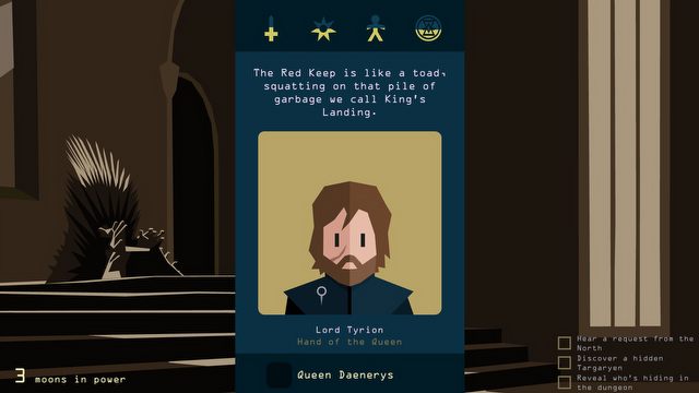 Żartobliwe odwołanie się do Tindera wynika z mechaniki tej pozycji. Na ekranie wyświetlane są karty, a my poprzez przesuwanie ich w lewo lub w prawo podejmujemy decyzje. Za prostą w obsłudze rozgrywką kryje się rozbudowana opowieść. Każdy wybór pociąga za sobą kolejne, których nie da się już cofnąć. Dzięki temu znana historia tworzona jest na nowo. Swoimi poczynaniami oddziałujemy na mieszkańców Westeros, sytuację polityczną rodu czy zaślubiny ważnych bohaterów – a łatwo się domyślić, jak może to wpłynąć na losy chętnych do zasiadania na Żelaznym Tronie.