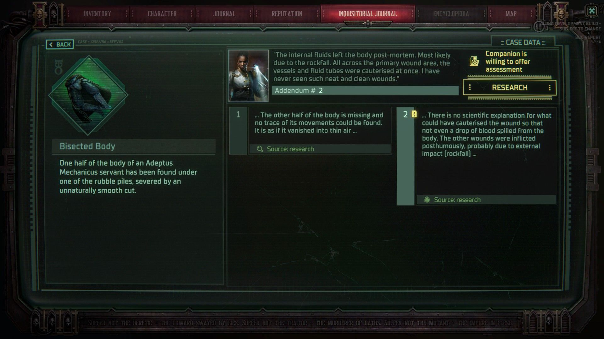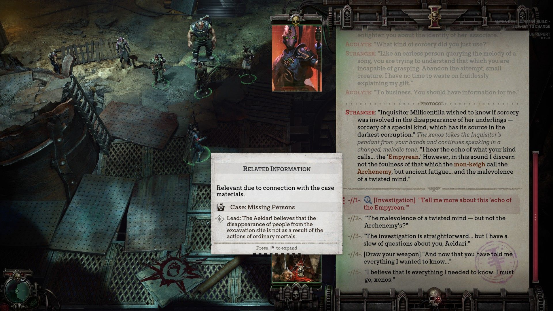 W ramach alfy deweloperzy udostępnili do wglądu fragment RPG-a, który prawdopodobnie najlepiej przedstawia, na czym polegać będzie rozgrywka (w dodatku w dwóch wersjach, które odzwierciedlają różny wpływ wcześniejszych wyborów gracza na całą lokację). Nasz akolita trafia do dolnych sektorów Marisportum trapionego przez klęskę powodzi i znikających obywateli. Jednocześnie bez śladu przepadł poprzedni Inkwizytor, który badał sprawę zamieszkujących okolicę obcych.