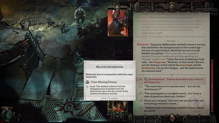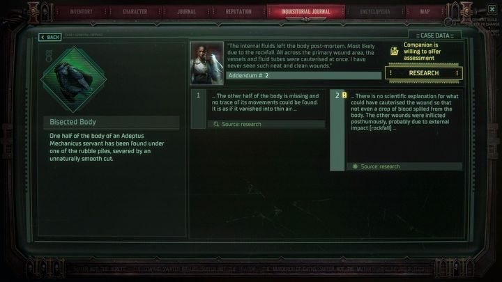 W Rogue Traderze i wielu innych RPG-ach cała akcja rozegrałaby się raczej w podobny sposób – parę starć na start, rozmowa z kluczowymi NPC-ami i możliwość zdania lub zawalenia testów w dialogach, kolejna walka, jakiś kluczowy wybór i starcie z bossem na koniec. W Dark Heresy jest inaczej. Zamiast sięgania po bolter, sięgamy po notatnik. I lepiej, żebyście się do niego przyzwyczaili, bo to właśnie najsilniejszy oręż dzierżony przez akolitę Inkwizycji.
