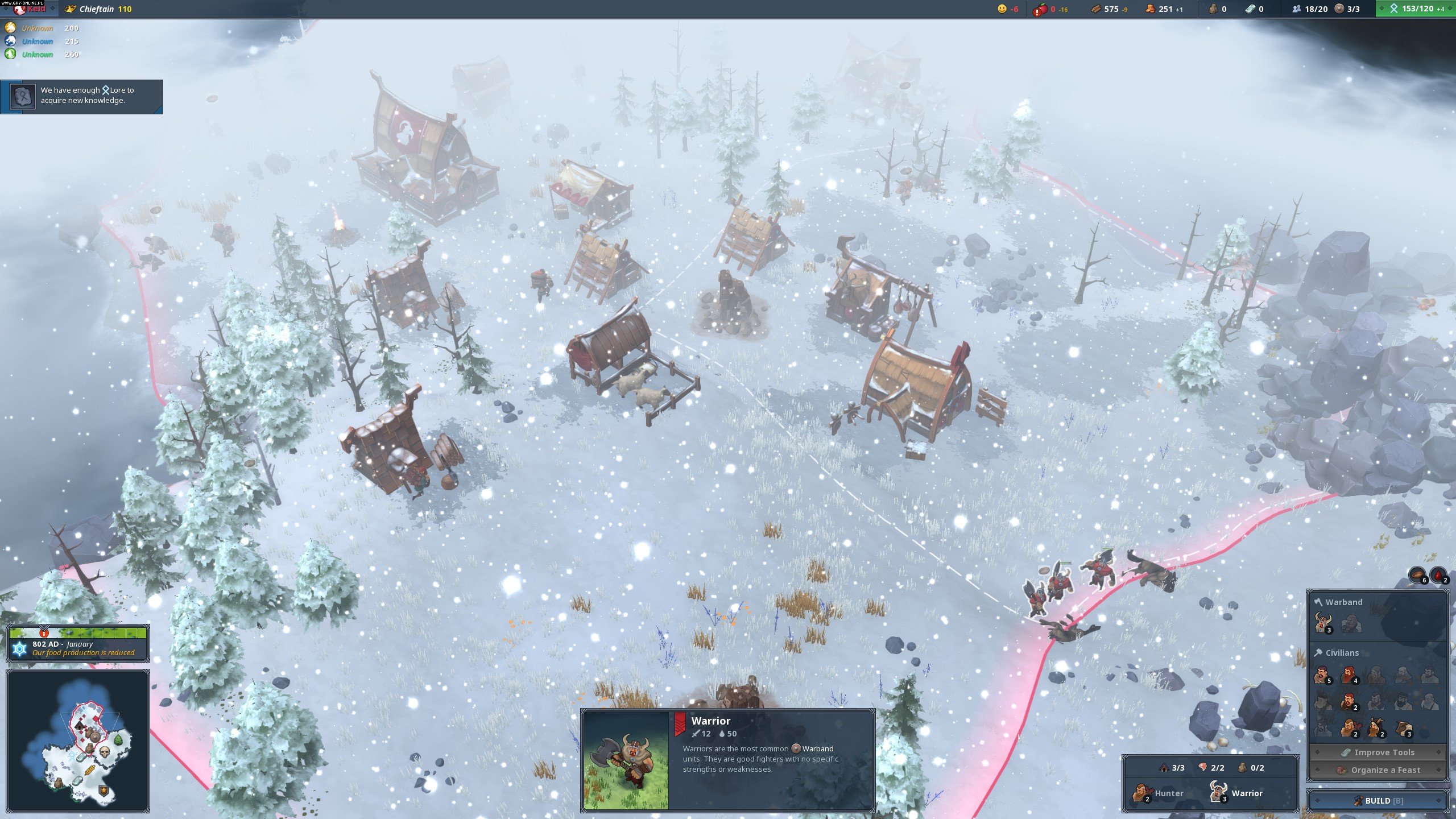 Ograniczenia w budowie to nie jedyna ciekawa mechanika. W toku rozgrywki zdobywamy punkty wiedzy (aby przyspieszyć ich kolekcjonowanie możemy wysłać poddanych do „pracy” w kamiennym kręgu), za które odblokowujemy nowe technologie z drzewka – dzięki nim przyspieszymy zdobywanie surowców czy leczenie przez szamanów. Dodajmy do tego fakt, że każdy z trzech dostępnych obecnie klanów różni się od siebie (jedni lepiej sobie radzą z przetrwaniem w trudnych warunkach, a drudzy to urodzeni wojownicy), a otrzymamy solidny fundament ciekawej gry.