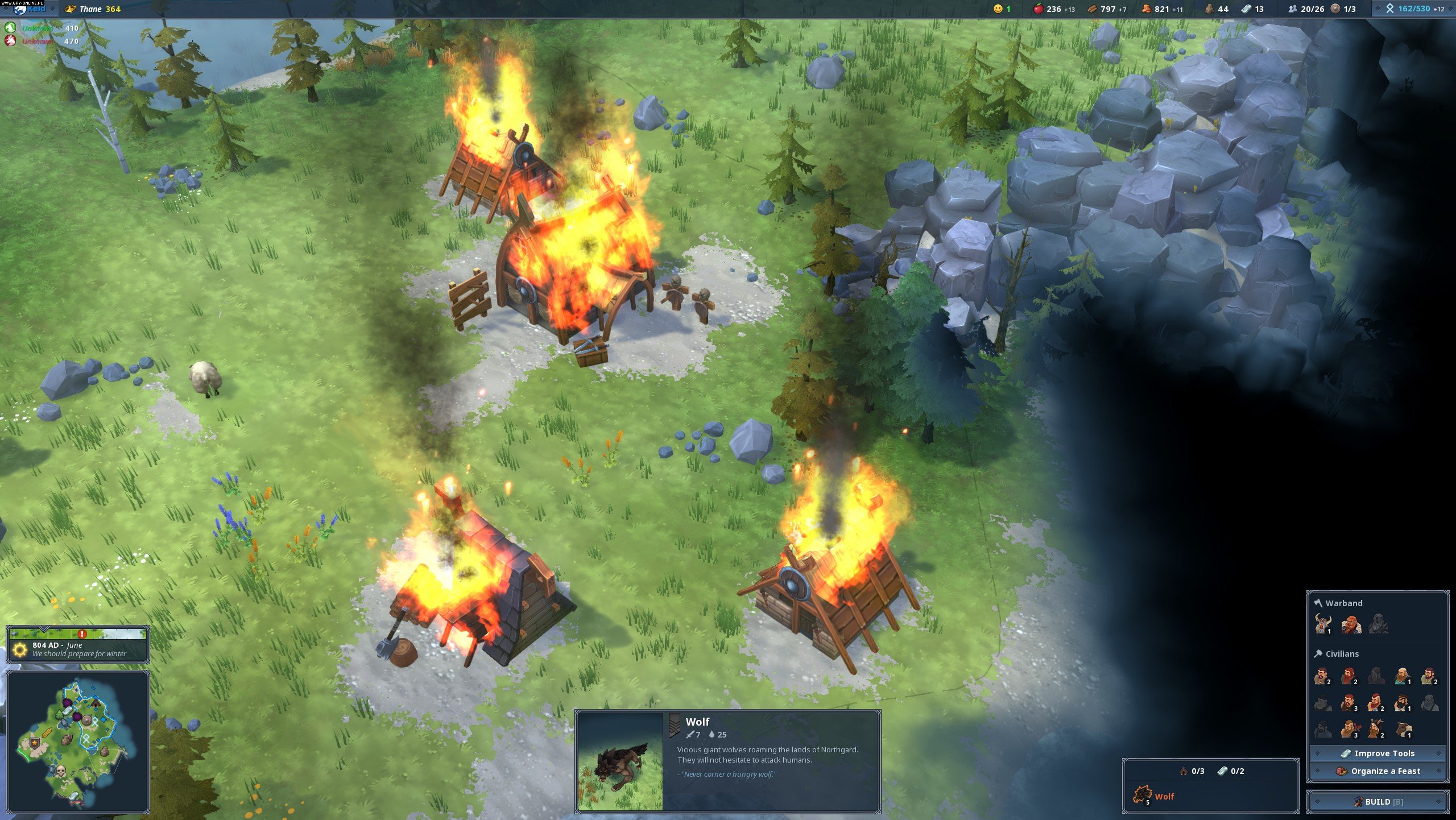 Myk w Northgard polega na tym, że na danym obszarze można postawić tylko kilka budynków (od 2 do 5). W efekcie zmuszani jesteśmy do ekspansji, bo żeby się rozwijać, potrzebujemy dużo miejsca. Do ekspansji przyczyniają się również ograniczone źródła surowców, więc po wykorzystaniu np. kamienia czy rudy żelaza, musimy szukać nowych zasobów. To fajna mechanika, ciekawy jestem jak sprawdzi się w rozgrywkach sieciowych – wymusza bardziej taktyczne podejście do planowania ekonomii naszego królestwa, nie promując np. masowego stawiania budynków jednego typu i spamowania jednostkami (tych nigdy nie mamy zbyt wiele, bo każdy osadnik jest na wagę złota, a będąc żołnierzem – oczywiście nie pracuje).