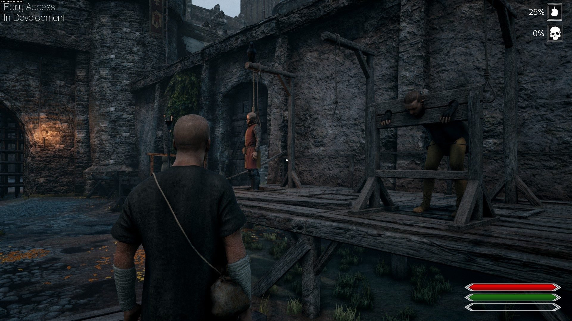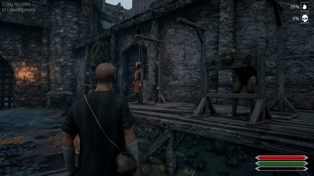 Nieco lepiej prezentuje się mechanika, ale jak na razie przy jej omawianiu bardziej trzeba posiłkować się opisami i obietnicami autorów niż osobistymi doświadczeniami. W grze bowiem poza pochodzeniem po okolicy i bezsensownymi pogaduchami ze sklepikarzami i strażnikami miejskimi, które za każdym razem przebiegają identycznie, da się zrobić niewiele. Można oczywiście coś kupić, ale trzeba mieć za co. Tu w sukurs przychodzi możliwość okradania ludzi lub straganów, na co żaden strażnik nie zwraca najmniejszej uwagi. Według słów twórców miało być inaczej, świat miał dynamicznie reagować na nasze poczynania już we wczesnym dostępie, ale na razie na szumnych zapowiedziach się skończyło. Być może zmieni się to w którejś z kolejnych aktualizacji.